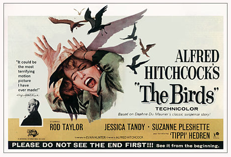 The movie ends with Melanie getting attacked by a roomful of birds, but then saved by Mitch and his mother-wife. Then they all hop (well, more like skulk) into Melanie’s Aston Martin and head out of the now deserted town, leaving flocks of birds to now finally poop in peace. But not before Mitch’s sister brings the pair of lovebirds with them. This girl needs a lesson in “correlation equaling causation.”